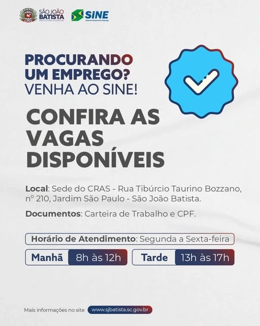 O Balcão do Trabalhador do Sine de São João Batista está com vagas abertas. Interessados devem comparecer ao posto com carteira de trabalho e CPF. Candidatos que atenderem aos requisitos serão encaminhados para entrevista.