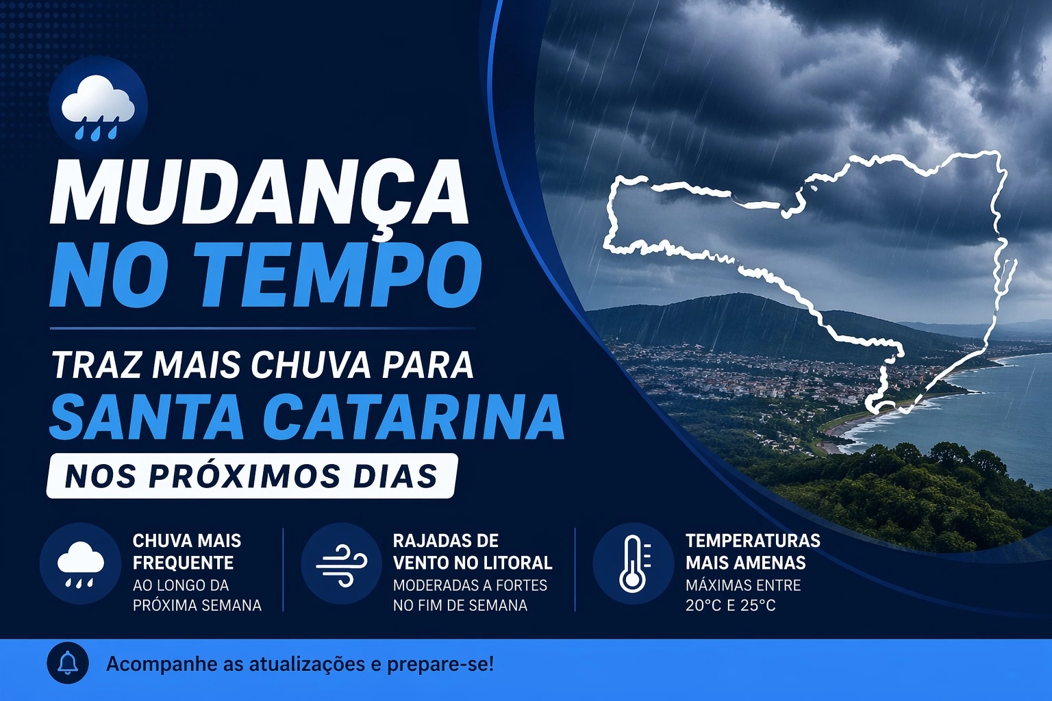 Entre o sábado (25) e o domingo (26), uma nova frente fria avança por Santa Catarina, espalhando a chuva por todas as regiões e trazendo possibilidade de temporais isolados. Desta vez, o sistema estará associado a um ciclone extratropical que pode provocar rajadas de vento de intensidade moderada a forte no litoral.