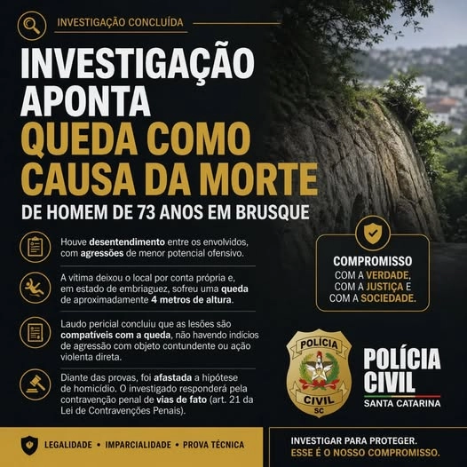 A Polícia Civil de Santa Catarina, por meio da Delegacia de Investigação Criminal de Brusque, concluiu o inquérito que apurava a morte de um homem de 73 anos, ocorrida após um episódio registrado em 16 de fevereiro de 2026, no bairro Santa Luzia.