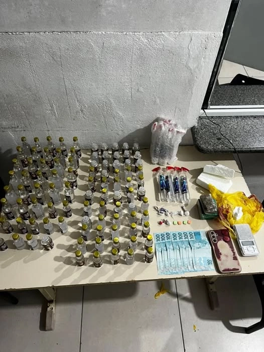 Diante do flagrante, a guarnição entrou na residência e confirmou a presença de drogas. Foram apreendidos 106 frascos de substância semelhante a lança-perfume e cerca de 500 gramas de cocaína.