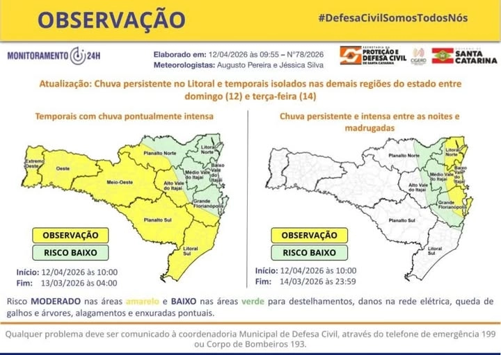 Já no Litoral, a circulação marítima ganha intensidade principalmente durante as noites e madrugadas entre domingo e terça-feira. As áreas mais afetadas devem ser a Grande Florianópolis, o Baixo e Médio Vale do Itajaí e o Litoral Norte, onde o risco para alagamentos e enxurradas pontuais é mais elevado.